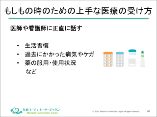 こうした薬の服用状況含め、私たちは医療を受ける際、医師や看護師などの医療従事者に”事実”をありのまま伝えることが大切になるなどの要点を、具体例を交えながらお話させてもらいました。